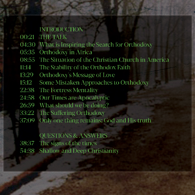 The lecture is entitled The Search for Orthodoxy Today and was given at the Saint Herman of Alaska Pilgrimage in August of 1981.